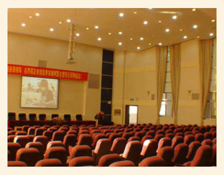 480座多功能礼堂 包括以下几个子系统:专业扩声系统、智能多媒体书写及投影系统、自动会议讨论及录音系统、智能集中控制及综合调光系统、摄像录像系统。可以作为大型会议、学术性报告会议、晚会演出、卡拉OK演唱、多媒体教学、大型培训、观看5.1声道电影等。