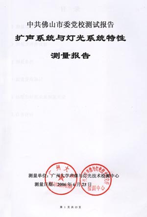 工程完工后,我公司委托广州大学声像与灯光技术检测中心对中共佛山市委党校扩声系统与灯光系统特性做测量。测试结果为:大礼堂的电声系统主要指标达到GYJ25-86《厅堂扩声系统声学特性指标》中语音与音乐兼用扩声系统一级要求;大礼堂的舞台灯光系统主要指标(照度、色温)均达到电视演播室[现场摄影、录像、转播及视像会议]灯光系统标准;报告厅的电声系统主要指标达到GYJ25-86《厅堂扩声系统声学特性指标》中语音与音乐兼用扩声系统一级要求。